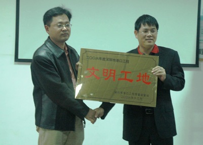 2007年1月17日,鹽田項目部雙喜臨門,先后得到業(yè)主鹽田國際頒發(fā)的"2006年度安全文明達標先進單位"和深圳市港口工程質(zhì)量監(jiān)督站頒發(fā)的"2006年度文明工地"兩項殊榮。