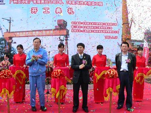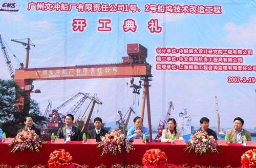 2007年3月19日,廣州文沖船廠1號、2號船塢技術改造工程舉行開工典禮。四航局有限公司孫國強總經理、二公司經理李惠明等出席了該儀式。孫國強總經理代表四航局在儀式上致辭,他說四航局與廣州文沖船廠有限責任公司是多年的合作伙伴,很感謝該公司一直對四航局的信任和支持,我們將秉承為顧客創造精品的企業價值觀,出色完成1號、2號船塢技術改造工程。孫總經理還與文沖船廠董事長徐國慶先生等為工程開工剪彩。