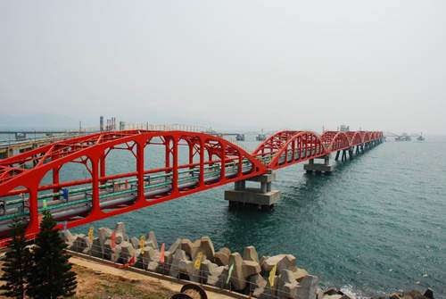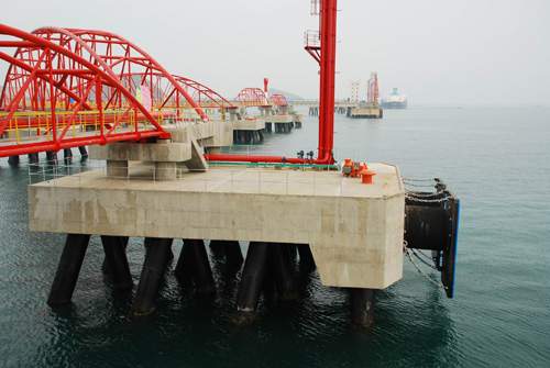 本工程為棧橋高樁墩臺開敞式碼頭,碼頭前沿離岸750米,泊位長490米,由1個工作平臺,2個靠船墩,6個系纜墩組成,工程是在原建15萬噸級碼頭的基礎上擴建為30萬噸的原油碼頭。