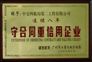 近日,二公司被廣州市工商行政管理局、廣州合同管理協會評為2006年度"守合同重信用企業",這是該公司連續8年獲得此榮譽稱號。