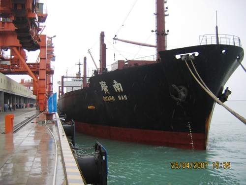 2007年4月25日下午,汕尾紅海灣發電廠7萬噸煤碼頭迎來了第一艘煤輪--"廣南"。該船靠碼頭上煤的成功,標志著汕尾煤碼頭正式投入使用。(林烏殿)