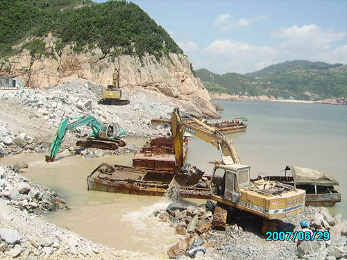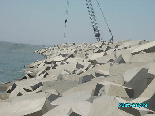寧德核電區域天氣反復無常,加之臨海及海上作業,潮位落差大,漲潮退潮快,再加上受供料方等多方面因素影響,施工一再推遲。為順利完成"6﹒30"防臺節點工期,專門召開趕工動員大會,制定周密詳盡的趕工計劃和工期倒排計劃,全體員工發揚敢打硬仗的作風,晝夜三班作業。挖機司機凌晨三點多就要趕到護岸理坡。工期緊,交叉作業多,水下擠淤爆破和挖泥、水上拋填各種規格的石料、護岸安裝扭王塊和推填理坡等同時進行,項目部全方位加強施工現場安全監控,確保了趕工期間萬無一失。