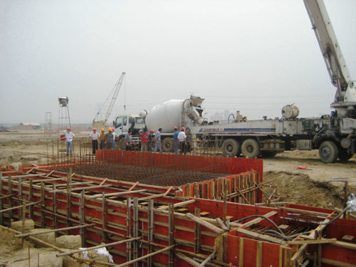 8月15日上午11點,青島海灣大橋預制場施工工地上傳來了陣陣喜悅的鞭炮聲,伴隨著泵車的轟鳴,第一個制梁臺座及橫移小車軌道梁開始混凝土澆筑,掀起了該工程勞動競賽的高潮。