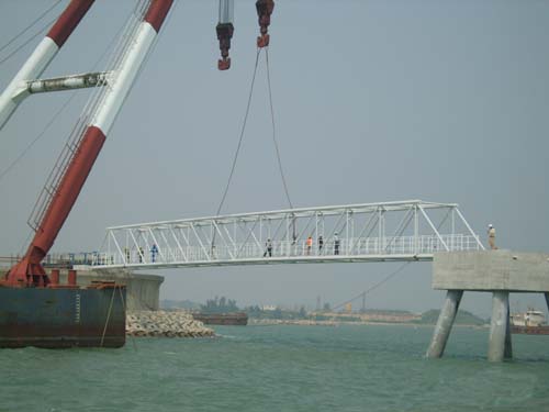 9月17日,福建LNG工程火炬棧橋第一榀鋼引橋順利安裝成功,緊接著第二榀鋼引橋也安裝成功,火炬棧橋鋼引橋共記兩榀,每榀長52.8米。