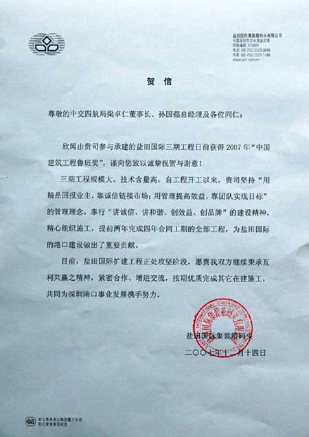鹽田國際在賀信中充分肯定我局:"自工程開工以來,貴司堅持"用精品回報業主,靠誠信鏈接市場;用管理提高效益,靠團隊實現目標"的管理理念,奉行"講誠信、講和諧、創效益、創品牌"的建設精神,精心組織施工,提前兩年完成四年合同工期的全部工程,為鹽田國際的港口建設做出了重要貢獻"。賀信說:"鹽田國際擴建工程正處于攻堅階段,愿貴我雙方繼續秉承互利共贏之精神,緊密合作、增進交流,按期優質完成其它在建施工,共同為深圳港口事業發展攜手努力"。