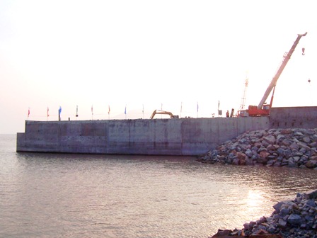 該碼頭工程總長109.5米,裝卸作業區寬度50米,碼頭陸域縱深67米,由12個鋼筋混凝土預制沉箱組成。該工程于2008年3月1日開工,合期工期275天,合同總額約為5980萬元。施工期間,二公司寧德項目部精心組織,克服了礁區高低不平、潮位變化較大、臺風及炸藥進場困難等不利因素影響,有效實現了重件碼頭主體結構的節點目標要求。