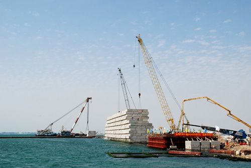 沙特RSGT碼頭工程共需澆筑胸墻71段,砼總量超過4萬立方米。由于胸墻底標高低于潮位線,施工受潮水影響很大,為確保水下混凝土澆筑質量,胸墻澆筑前,項目部制定質量保證措施,進行了現場試驗并經咨工認可。胸墻澆筑時,各職能部門安排人員輪流值班,經過7個小時的連續施工,第一段胸墻澆筑勝利完成。