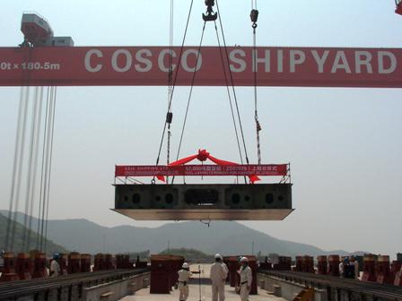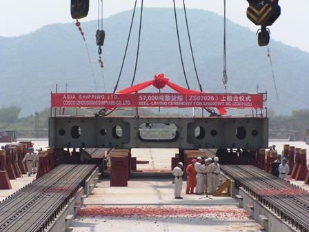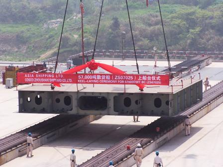 4月15日,隨著首個造船分段的順利安放,舟山中遠一號船臺正式投入試生產。