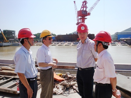 7月10日上午,廣東省交通廳港口航道局局長鄧立文、江門交通局局長肖繼明和新會區相關主管部門領導在四航局副總經理方丘洚陪同下,到新會基地建設現場進行檢查并指導工作。
