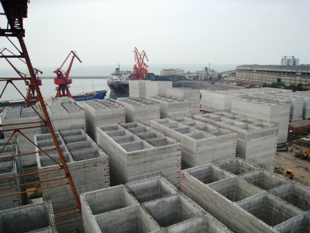 海口港馬村港區擴建一期碼頭工程共需要預制、安裝沉箱75件,于2008年6月26日開始預制,第一批44件沉箱于2008年11月26日預制完成。目前,已安裝沉箱60件,胸墻澆筑的各項準備和其各個工序的施工工作正有條不紊地進行。