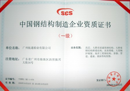 10月22日,廣州航通船業有限公司榮獲鋼結構制造壹級資質,日后可承攬的業務范圍包括:高層、大跨房屋建筑鋼結構、大跨度鋼結構橋梁結構、高聳塔桅、大型鍋爐剛架、海洋工程鋼結構、容器、管道、通廊、煙囪等構筑物。