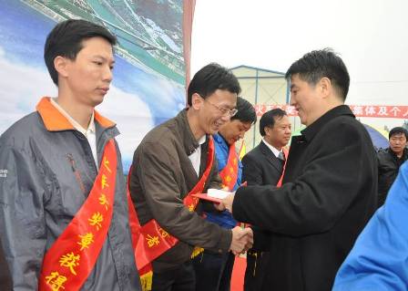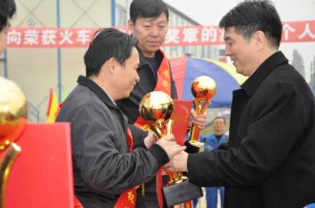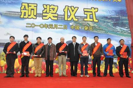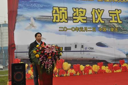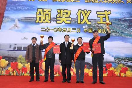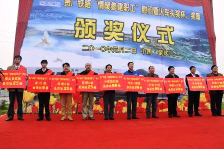 1月2日,貴廣鐵路"情暖參建職工"慰問暨火車頭獎杯、獎章頒獎活動隆重舉行,四航局貴廣項目喜獲中華全國鐵路總工會授予的2009年客運專線建設火車頭獎杯,四航局貴廣鐵路工程指揮部常務副指揮長盧玉榮和三項目經理部鄧宏觀榮獲2009年客運專線建設火車頭獎章。
