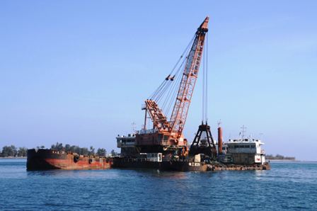 該工程內容包含滾裝碼頭基槽及港池挖泥,挖泥斷面層總方量約為97萬方,其中約46萬方的炸礁量,合同工期13個月。鑒于KBR嚴格的管理模式,項目部精心籌備前期工作,合理利用有限資源,及時組織人員設備進場,提前采購炸藥,確保了項目順利開工。