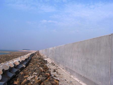北護岸擋浪墻工程高3米,長854米,累計混凝土2100多方,是圍堰及陸域形成工程標段中的"門面工程"。該項目部明確"重質量、美外觀、保進度"的施工目標,全體員工經過58天的不懈努力,安全優質完成擋浪墻澆筑,得到業主、監理的一致認可。