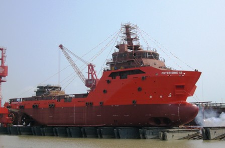 該船型是航通公司在成熟建造系列拋錨供應船基礎上,與新加坡設計公司共同開發的升級換代新產品,技術含量和附加值較高。該船主機裝機容量8400匹馬力,雙機雙可變距槳,發電機裝機容量3760KW,全自動化控制(無人機艙),具有2級動力定位功能,是主要服務于海洋石油平臺和FPSO(大型石油生產船),集拖帶、拋錨、消防、救護、供應于一體的多用途船舶。該船入級美國船級社ABS,可在無限航區航行。