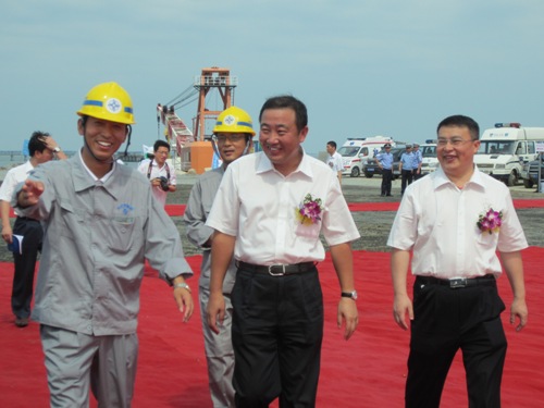 廣東省委常委、常務副省長朱小丹在湛江市委書記、市人大常委會主任劉小華,四航局董事長、黨委書記梁卓仁等人陪同下,來到北護岸觀禮臺,察看了30萬噸大型散貨碼頭的沉樁施工,梁卓仁向朱小丹介紹了30萬噸大型散貨碼頭的施工組織與計劃。
