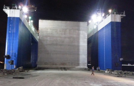該項目共有5800噸大型沉箱20件,沉箱長24.1米、寬20.6米、高20.5米,為目前南方最大的沉箱,也是目前四航局承建的最大沉箱。項目部克服了出運難度大、船機及工期緊,通過開展“大干40天勞動競賽”、24小時作業(yè)等措施,最終比原計劃提前5天完成出運任務(wù)。
