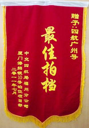 近日,福州分公司招銀10號泊位碼頭工程項目部把一面繡著“四航廣州號——最佳拍檔”的錦旗送達三公司,并轉達了該工程業主、監理、項目部對“四航廣州”號高效施工的贊揚與謝意。