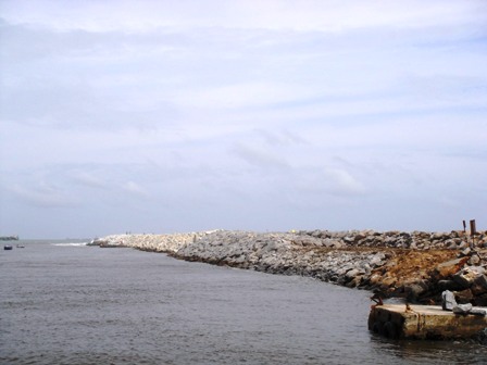 該項目西防波堤施工初期一直處于邊設計、邊修改、邊施工的狀態(tài),直至2010年7月26日,項目部才正式收到西堤最終版施工圖紙。隨后,項目部加強各工區(qū)人員的組織協(xié)調(diào),合理開展水上、陸上石料運輸?shù)裙ぷ鳎陂g克服了業(yè)主資金不到位、尼日利亞總統(tǒng)大選政治影響、當?shù)刂伟残蝿輴夯⒃庥鎏卮蟮奶煳拇蟪钡壤щy,邊施工邊想方設法規(guī)避資金、安全風險,全面鋪開西堤施工。