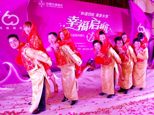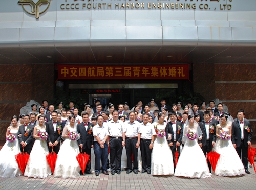近年來,中交四航局每年招收應屆畢業生300多人,現有員工近6000人,其中35歲以下青年3252人,年輕人已成為了企業的中堅力量。四航局黨委堅持以人為本,推進和諧四航建設,并積極探索黨建帶團建有效途徑,先后榮獲“全國先進基層黨組織”和“中央企業黨建帶團建工作先進單位”。因為建筑工程企業工作特點,來到中交四航局的年輕人剛剛從學校畢業便走到了施工一線,他們每天面對的是圖紙、機械、挑燈夜戰,正因為有了他們,企業煥發著生機和活力。為增強青年員工的凝聚力,體現和諧四航理念,四航局結合施工企業工作特點,從2007年開始,局團委每兩年策劃組織一屆以“和諧四航,真愛永恒”為主題的青年集體婚禮活動,至今年為止,共舉辦了三屆。集體婚禮的成功舉辦,體現了四航局對青年員工的關愛之情,增強了青年員工對企業的歸屬感和忠誠度。