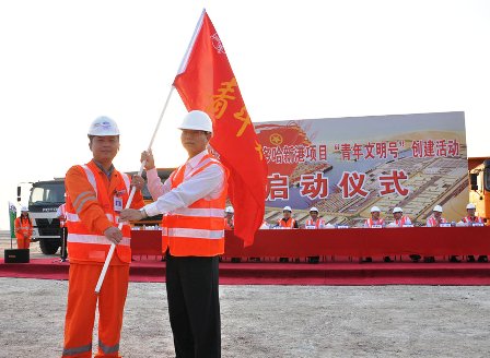 又訊 10月11日,四航局總經理孫國強、中國港灣集團副總經理莫文賀、四航局副總經理李惠明等領導出席了多哈新港項目部“青年文明號”活動啟動儀式。總經理孫國強為青年突擊隊授旗。