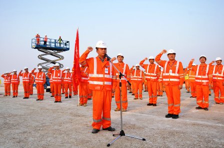 全體青年突擊隊員莊嚴宣誓:決心將以一流的技術、一流的管理、一流的業績,在美麗的波斯灣之濱,建造雄偉壯麗的現代化海港;用青春和智慧、激情和汗水,擦亮四航品牌,拓展中交集團大海外發展戰略,向卡塔爾人民和祖國人民交出一份滿意的答卷。