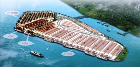 該工程包括25萬噸級鐵礦石接卸碼頭1座、10萬噸級散貨碼頭1座、港池與回旋水域、陸域形成、地基處理、圍堤、隔堤、道路堆場及基礎、給排水、消防、供電等工程。其中陸域形成總面積約44.5萬平方。
