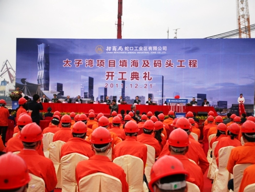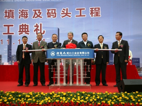 12月21日,蛇口工業區太子港項目填海及碼頭工程開工典禮在深圳蛇口港隆重舉行。 中交股份總裁劉起濤、副總裁陳云,招商局集團總裁李建紅,蛇口工業區有限公司總經理楊天平,四航局總經理孫國強等出席儀式。招商局董事長傅育寧宣布項目開工,副總裁孫承銘主持開工典禮。中交股份總裁劉起濤、副總裁陳云、招商局董事長傅育寧、四航局總經理孫國強等領導推動“推桿”,共同啟動開工儀式。