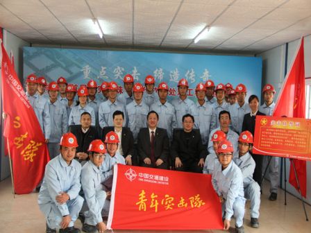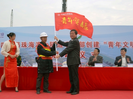 12月26日,一公司珠海澳大隧道項目部、研究院珠海神華軟基處理項目部分別舉行“青年突擊隊”授旗儀式,四航局黨委副書記張猛為兩項目部青年突擊隊授旗。