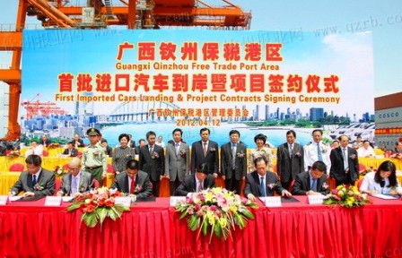 廣西壯族自治區副主席楊道喜,欽州市委書記、市人大常委會主任張曉欽,市長肖鶯子,中國汽車工業進出口總公司總裁張福生等領導出席簽約儀式,并為首批進口汽車到岸剪彩。