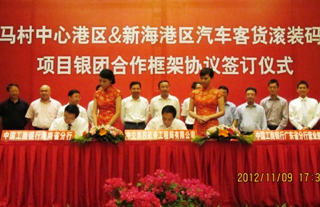 11月9日下午,四航局與工商銀行海南省分行及工商銀行廣東省分行營業部的“海口港馬村中心港區及新海港區汽車客貨滾裝碼頭工程”項目銀團合作框架協議,海南中交四航建設有限公司與工商銀行海口秀英支行“新海港區2.2億、馬村港4.5億元”項目前期貸款合同簽約儀式在海口市舉行。