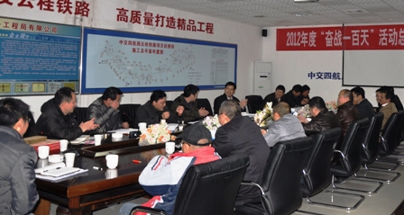 1月7日,四航局云桂鐵路項目召開2012年度“奮戰一百天”活動總結暨先進表彰大會。四航局副總經理黃煥謙、副總工程師顧剛,項目各分部及受表彰的先進個人等共40余人參加。