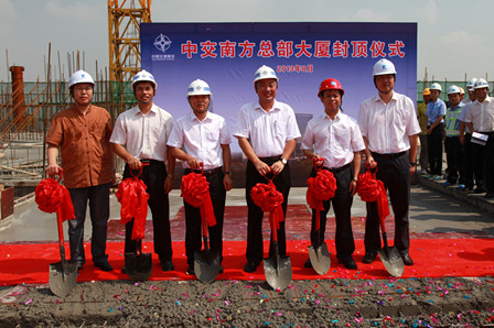 有關領導致辭后,四航局董事長、黨委書記梁卓仁,總經理孫國強、副總經理黃煥謙及中建三局常務副總經理李勇、中船九院副總經理孫偉軍、廣州珠江監理公司總經理張國宇共同為總部大廈頂層澆筑最后一斗混凝土,標志著中交南方總部基地大廈正式封頂,主體工程建設圓滿完成。