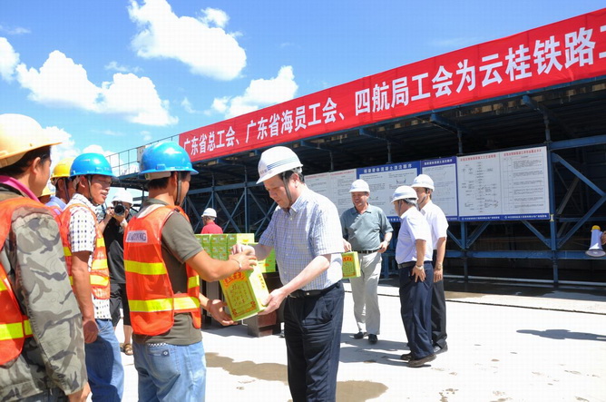 7月9至10日,廣東省總工會、省海員工會、四航局工會聯合組織,深入四航局云桂鐵路項目一線送清涼,慰問一線員工。廣東省總工會黨組成員、紀檢組組長廖汝捷,省海員工會主席康盛忠,四航局黨委副書記、工會主席張猛,副總經理黃煥謙等出席,行政保衛部負責人等參加。