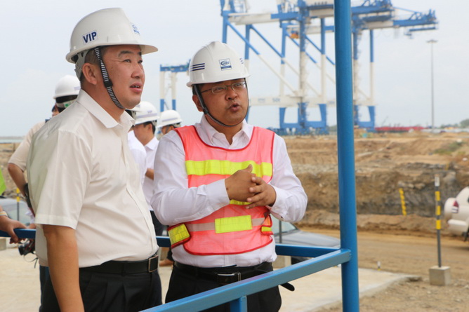 梁卓仁一行首先來(lái)到漢班托塔馬特拉國(guó)際機(jī)場(chǎng)項(xiàng)目,察看了一期項(xiàng)目建設(shè)情況,了解了二期項(xiàng)目籌備情況。隨后立刻奔赴35千米外的漢班托塔港二期工程項(xiàng)目部,登上中國(guó)港灣承建的漢班托塔第一高樓——斯里蘭卡港務(wù)局行政辦公大樓,從樓頂察看了項(xiàng)目一期全景及二期人工島、公共服務(wù)碼頭等施工場(chǎng)景,并深入基坑沉箱施工觀禮臺(tái)、公共服務(wù)碼頭等施工現(xiàn)場(chǎng)了解了工程進(jìn)展、安全質(zhì)量等情況。