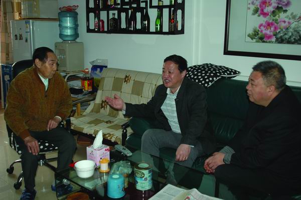 四航局黨委副書記、工會主席張猛慰問98歲高齡的退休老員工湯紹林(左一),為他送上慰問金和慰問品,并致以新春祝福。
