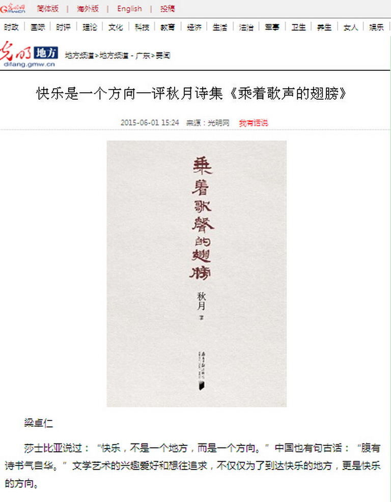 6月1日,光明網(wǎng)刊發(fā)全國勞動模范、四航局董事長、黨委書記梁卓仁的詩評文章《快樂是一個方向》,同時,四航局員工創(chuàng)作的個人詩集《乘著歌聲的翅膀》受到社會關注。