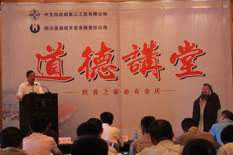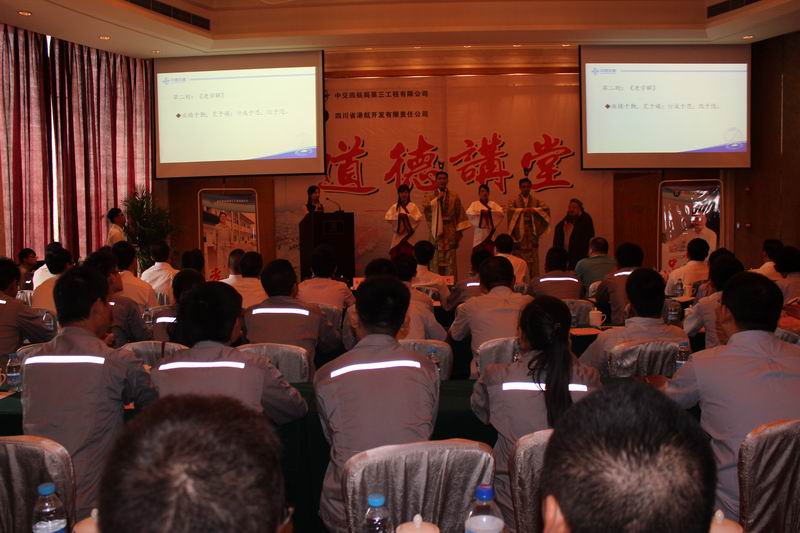 本次“道德講堂”是四航局首次與業(yè)主聯(lián)合舉辦的講堂活動。活動主題為感恩,分為合唱《公民道德歌》、靜默醒身、誦讀經(jīng)典、學(xué)習(xí)模范、暢談感受、敬送吉祥等六個環(huán)節(jié);分享了三公司“孝”的模范毛高旺孝老愛親、四川港航“忠”的模范劉躍盡忠職守的感人故事。