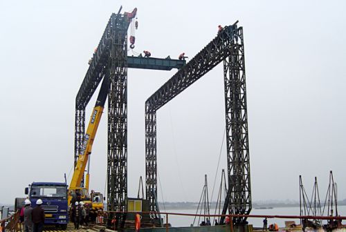 這次龍門吊安裝是水上作業,時間緊,任務重,水上作業給安裝工作帶來了很大困難,橋梁分公司全體員工迎難而上,克服了種種困難,在確保安全施工的前提下,精心組織,積極與項目部協調,保證材料設備和安裝人員準時到位。在施工人員的努力下,順利完成了龍門吊主體結構安裝,為項目部下一步施工提供了設備保證。左圖為正進行龍門吊安裝。 (趙芳芳)