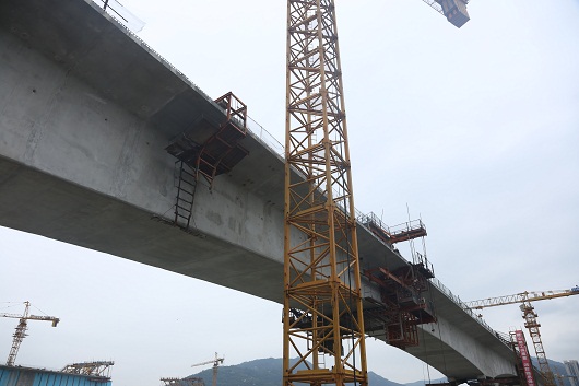 12月4日, 四航局珠海城際項(xiàng)目部負(fù)責(zé)施工的前山水道特大橋最大跨度連續(xù)梁澆筑完畢,標(biāo)志著該特大橋主橋順利合攏。