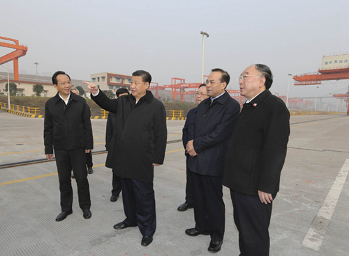 習近平聽取了長江上游航運中心建設、鐵路公路水路聯運等情況介紹,察看了正在作業的集裝箱船,聽說渝新歐(重慶—新疆阿拉山口—歐洲)國際鐵路沿線國家實現一次報關查驗、全線放行,他贊賞“挺好”。看到港口設施齊備,已初具規模,他說:“這里大有希望”。