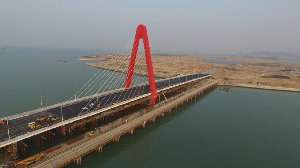 該工程是國內首座大型離岸式生態人工島——雙魚島和島外陸地連接的主要通道。連接橋為海上斜拉橋,全長685.44米,主橋采用連續梁獨塔雙索面斜拉橋,主橋橋寬39米,引橋橋寬37米,索塔高度90米。工程歷時3年建設完成。