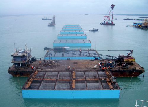 該工程一座長330米的10萬噸級煤碼頭需預制安裝沉箱10件,單件重達2938噸。面對沉箱預制、浮運、安裝安全風險大、施工組織難度高的挑戰,防城港項目部制定科學合理的施工方案,做好技術安全交底,制定"沉箱出運安裝應急預防措施","四航防城港"號提前到現場進行試潛,并認真組織好典型施工,于6月26日安全優質高效完成了10個重型沉箱的出運安裝任務。