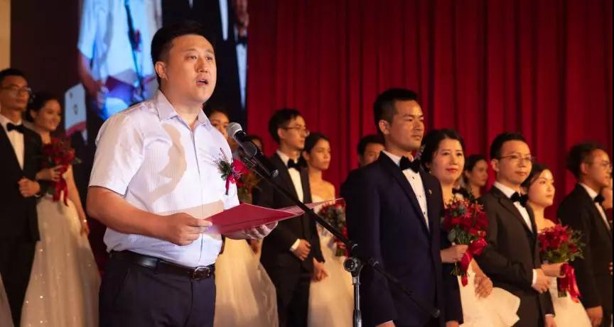 隨后,新人代表發表感言,他們為能在新中國成立七十周年之際舉辦婚禮,感到幸運與驕傲;為生在和平安寧的國度,長在繁榮富強的國家,感到幸福與自豪。他們感謝父母、企業、愛人的關心和支持,莊重承諾未來會常懷感恩之心,感恩偉大祖國給予的繁榮穩定的生活局面,建好“小家”,融入“大家”,為實現中華民族偉大復興的中國夢作出應有的貢獻。