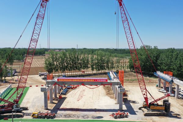 本次完成架設的箱梁為蘭溝洼特大橋蘭溝河段,長30米,重約96噸,采用履帶起重機雙機抬吊方式架設。
