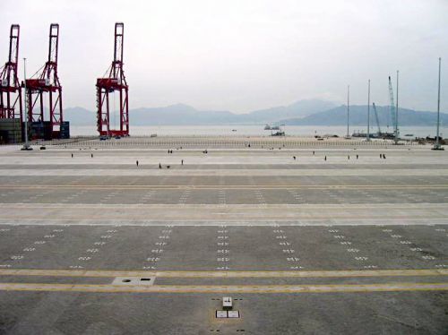 該工程包括道路、堆場、主變電所、維修車間等,總面積28萬平方米。堆場鋪面結構分砼面層、聯鎖塊鋪面兩種,其中聯鎖塊鋪面16.7萬平方米,聯鎖塊強度等級為C60,工程質量目標為創國家級優質工程。